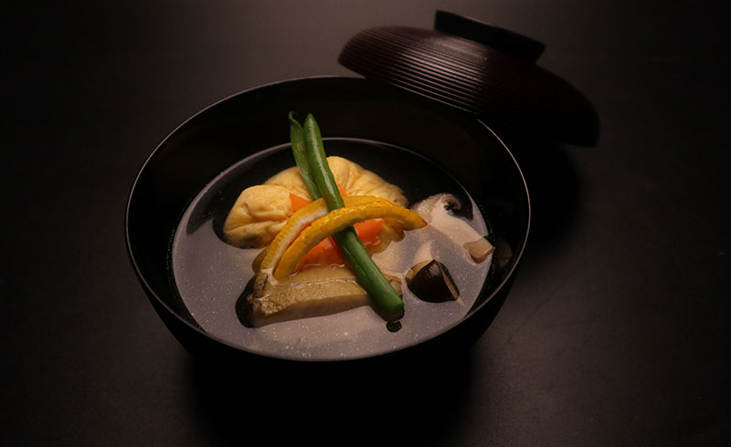 最初の一口目で塩を味わっていただくと大豆の甘さが引き立ちます。 葛でとろみをつけた醤油のあんを用意しました。 -