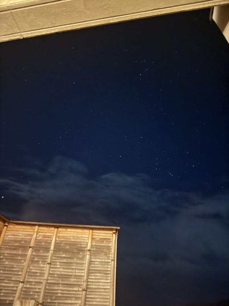 明日が新月なので お月様の姿は見えませんが 薄雲と湯けむりの向こうに 美しい星空が広がります。 是非写真を拡大してみてくださいませ。 寒くなってきたから 露天風呂はいいや なんて、そんなのもったいなさ過ぎる。 思い出に残る星空、 目に焼きつけてくださいませね。 ちなみに眩しい朝日も最高です。