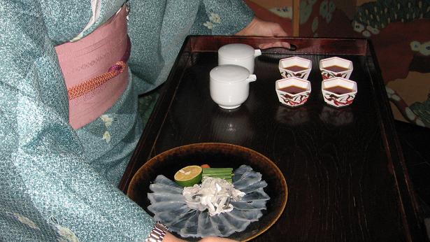 3階廊下ではてっさ(ふぐ刺身)を運ぶところ。