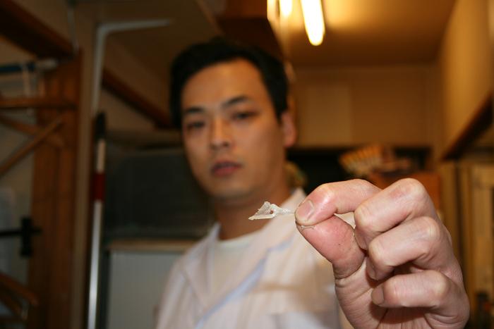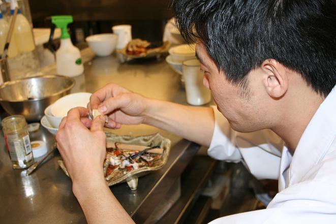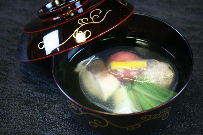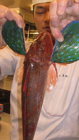 今月のお椀 お魚の切り身は「ほうぼう」葛打ちです。 こんなに綺麗なお魚でふきやに来た時はまだ生きています。 骨の周りは塩焼きにして 板前さん達のまかない食になります。 手でむしってパクパク 夢中で食べてるこの横顔は原さんでーす すると 青木板長が、胸ヒレ付け根あたりに 「ほうぼうのほうぼう」発見 「鯛の鯛」が縁起物として有名ですが 体と同じ形をした骨があるんです。 こんな感じ面白いですね