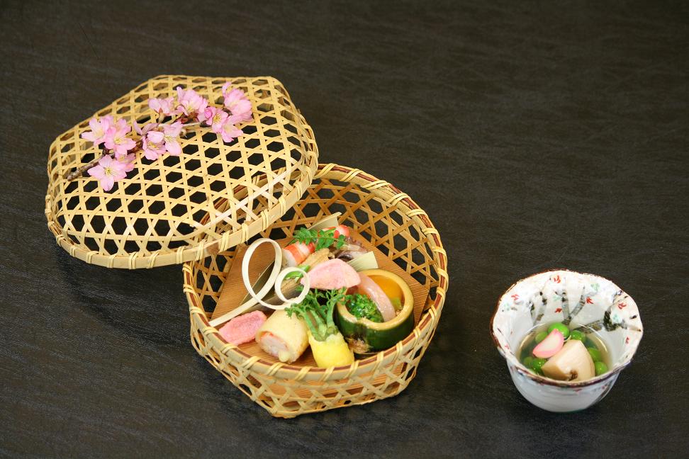 献立が変わりました 4月は春という強烈な季節感をもった食材が 一斉に旬をむかえます。 前菜は賑やかに お花見の風情を 白竹籠に盛り込みました。 ちらし寿司 海老・穴子・つくし 青竹ゼリー 温泉卵の黄味を調理したもの 菜の花・生ハム・かに羽二重揚げ・たらの芽 露天風呂でお花見をして こんなお料理を頂くなんて 1年間で桜の咲くこの時期だけの特別なもの 是非是非どうぞ~
