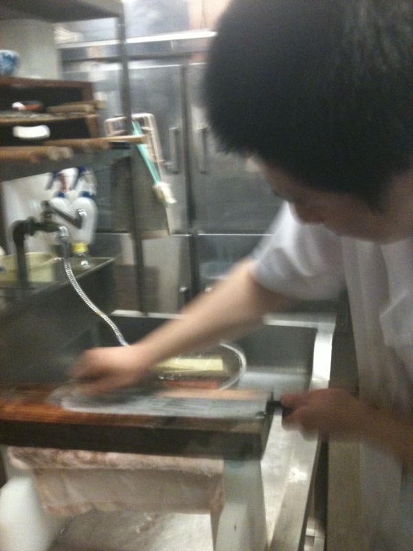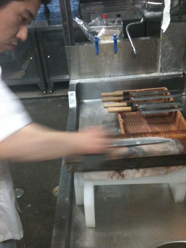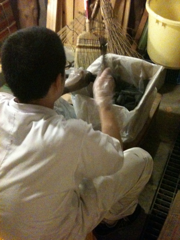 人目に触れる事なく 下積みの努力をしている人はどこにでもいますよね。 TV番組「チューボーですよ」に登場するような 未来の巨匠はふきやにもおります。 夜、私が外出先から戻ってくると ガレージで翌朝の焼海苔用の炭を割っていた高橋君 こちらは包丁を磨く小野君 これが一日の最後の仕事です。 板前修業は朝は早いし 夜は遅くなるし大変な職業です。 でも親方を目標として頑張ってね