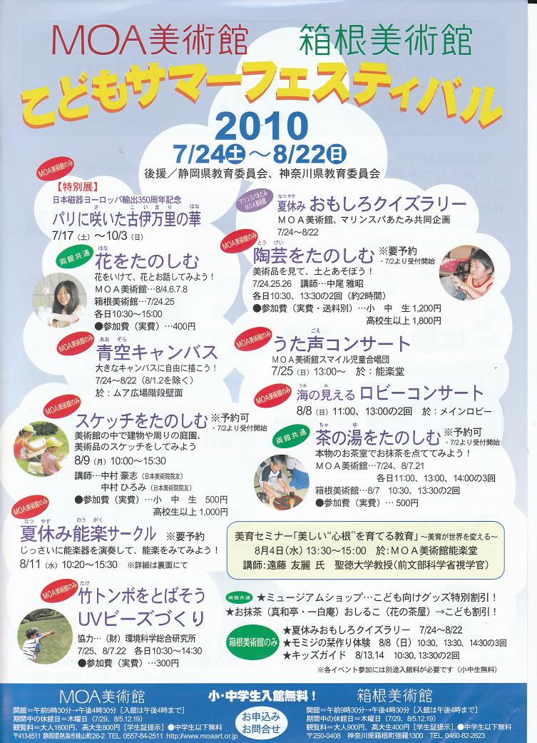 熱海のMOA美術館まで ふきやからお車で20分程度です。 夏休みはお子様向けのイベントが盛り沢山 (写真をクリックすると大きくなります。) 私は子供が小さい頃は毎年連れて行っておりました。 「能楽サークル」「茶の湯をたのしむ」が特にオススメです 広くて充実した美術館ですので、お天気に関係なく楽しめます