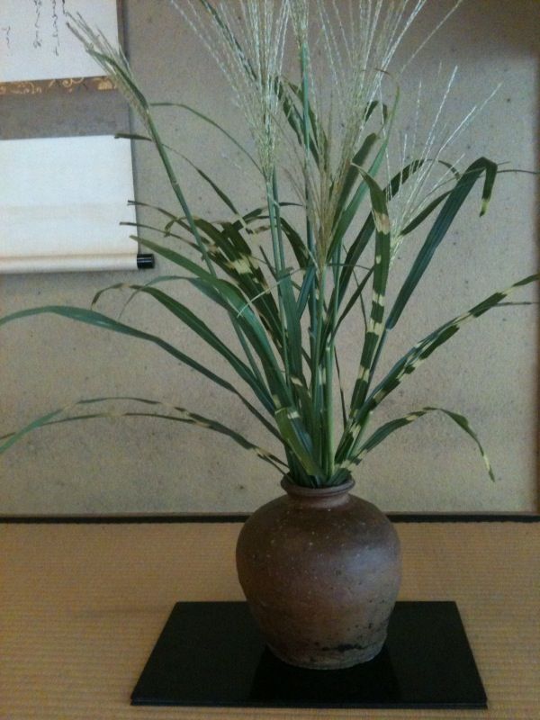 台風一過で秋を感じるお天気です 自宅の庭で斑入りの芒(すすき)を発見 横に斑が入ったもので 鷹羽薄とか矢筈芒とも言われます。 この芒は私のお気に入り 千家十職の塗師中村宗哲(先代12代)の塗りと いい感じ~と自己満足 斑入りは 日本では昔から珍重されてきましたが 葉の葉緑素の一部が失われている遺伝だそうです