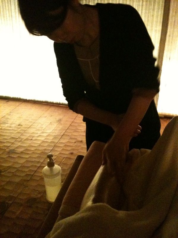 1階大風呂近く 湯上り処 素足に心地よい「なぐり」を施した木の床 壁一面の堀木エリ子さんの和紙と照明 デンマークの椅子 この空間でリフレクソロジーを受けました。 担当は尾形さん 足裏を押しながら 「右の肩が凝ってますね~。」などわかるそうです。 そのうちに私のお腹がゴロゴロ動き出しました。 足の裏には全身のツボがあり 腸のツボを刺激すると腸が動き始めるのです。 ちょっと痛い時もありましたが 終わると足が軽くなるばかりか 肩もすっきり軽くなり 足先からポカポカ 極楽極楽~