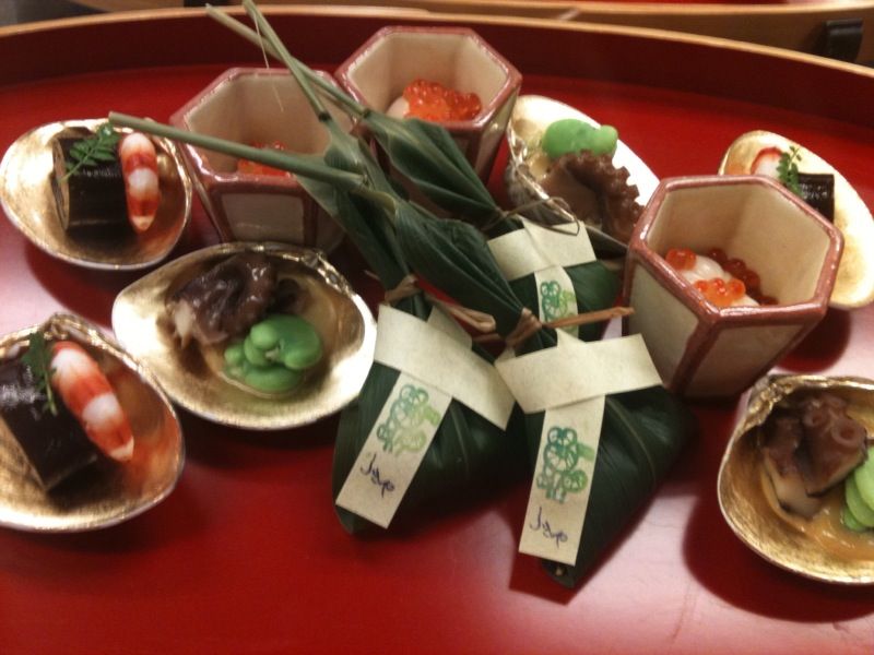 貝合わせの蛤に 海老 鰊昆布巻 飯蛸旨煮 天豆