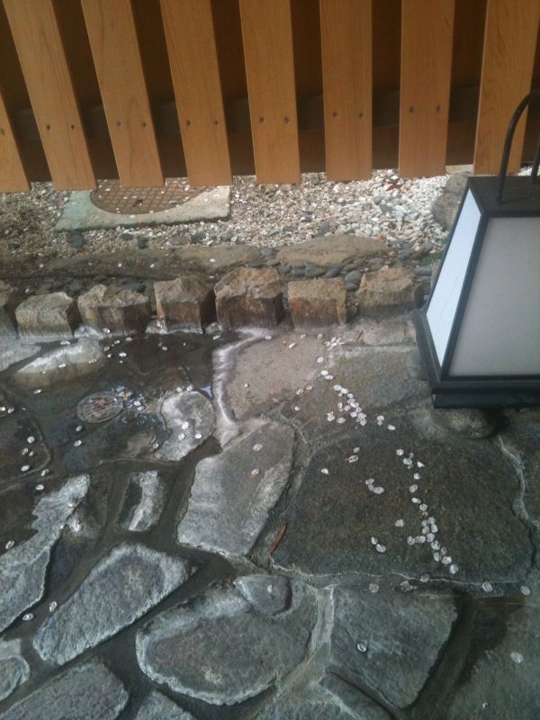 あちこちに桜の花びらがあって もちろん湯船にも。 思わず長湯してしまいますからご用心ですね