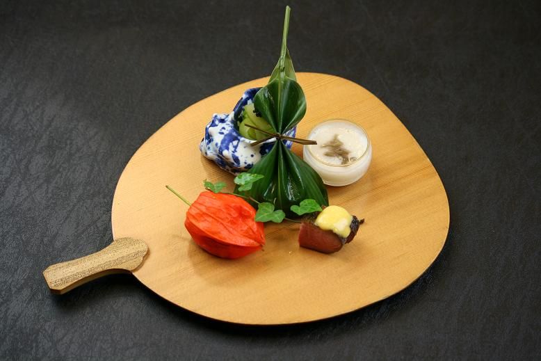 今月の前菜は すっきりとした白木の盛器です。 そう 優しい風を贈る団扇の形です。 白瓜キャビア 新秋刀魚棒寿司(笹の葉に) 石垣枝豆(ほおづきに) 夏鴨黒胡椒薫 順才とろろ 今年は節電の夏ですが 暑い夏を愉しむ気持ちで過ごしたいですね♪ そういえば昨晩 満月を眺めながら露天風呂に入りました 露天ならではの風を感じて 「こんな素敵な日があったって事を覚えておこう」 なんて思えるくらい心地よい風でした