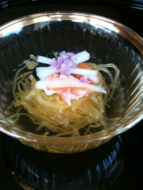 ずわい蟹、雲丹、青海苔、独活、花穂を乗せて
