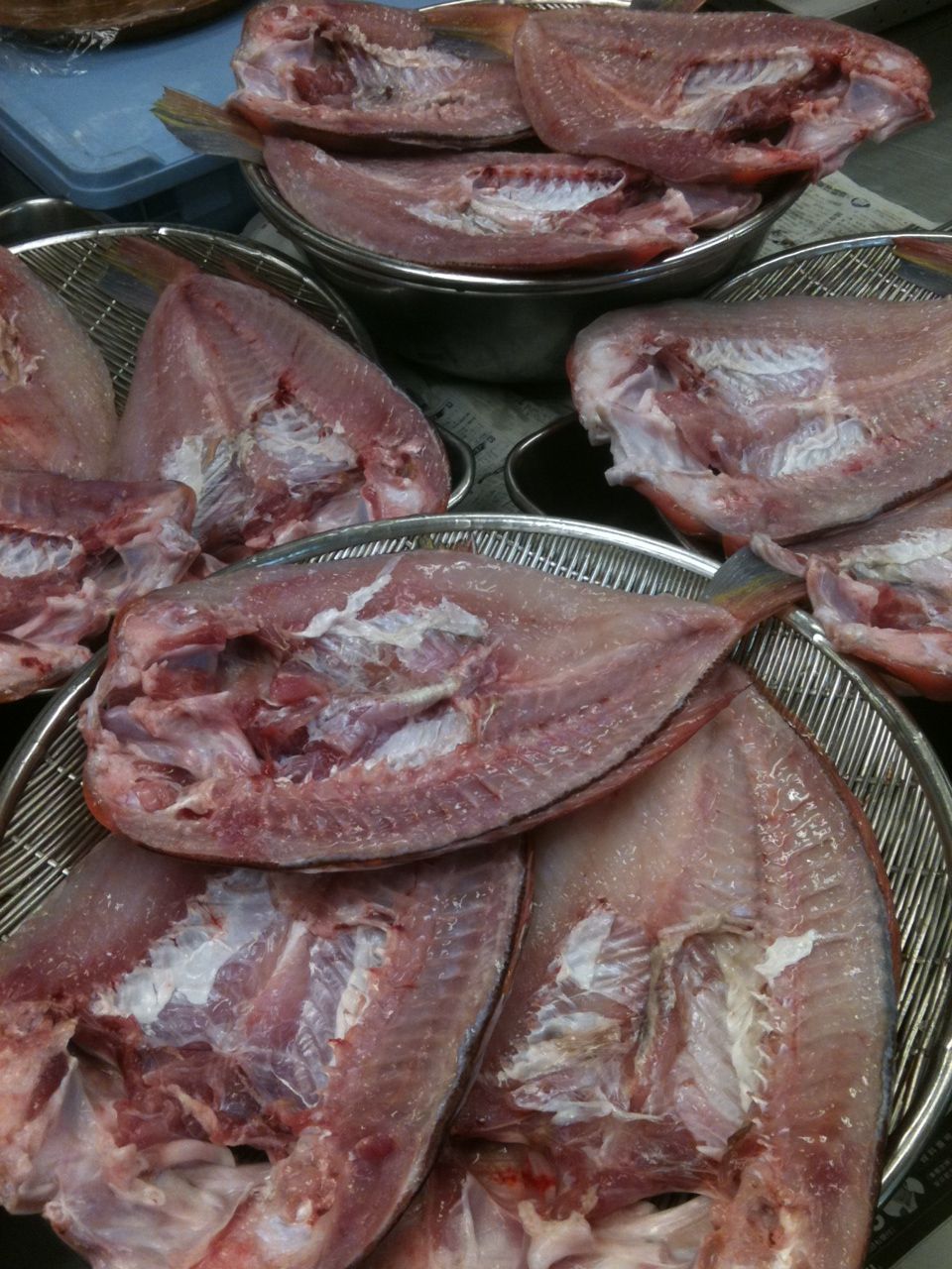 味わいに甘味、旨味がある事から甘鯛、尼鯛と言われます。 海水3%より濃い5%の塩水に尼鯛を漬けます。 2時間くらいでしょうか? 秋晴れの風通しの良い所で半日干すと 丁度良い興津干しが出来上がります。 鱗も美味しい魚なので 遠火で時間をかけて酒を振りながら こんがりと焼き上げます。 すだちを絞って皮ごとお召し上がり下さいませ