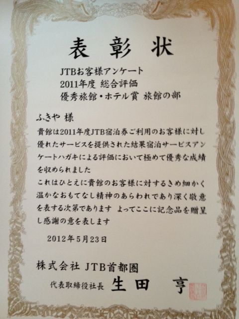 優秀旅館として今年も表彰されました