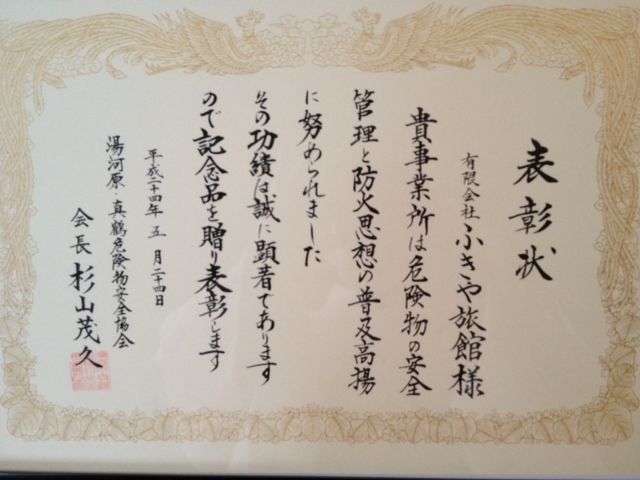 一昨日、表彰されました 危険物の安全管理と防火思想の普及高揚に努めた という内容です(・◇・)ゞ 記念品もいくつか頂きまして 防災知識も学べるトイレットペーパーです さて、本日 5月の第4土曜日は「湯かけ祭り」です。 毎年続けてお越しのお客様が何組かいらっしゃいます。 お客様同士も「あら、今年もご一緒ね」 と、仲良くなったり致します 団体様はワインがメインのご宴会でした
