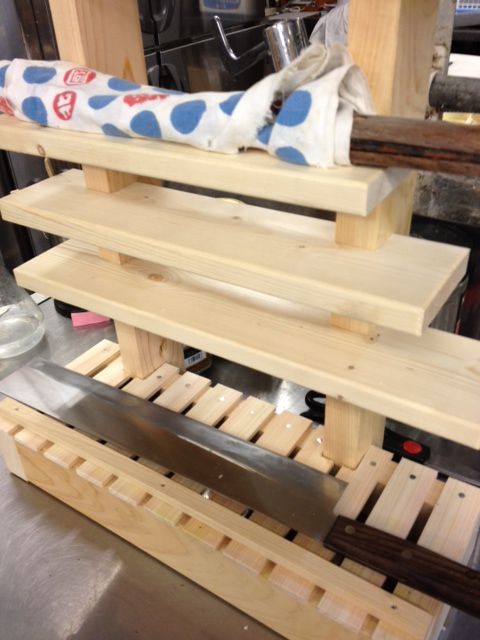 うちの番頭さんはとても器用な方で 「すのこ」や「おかもち」や「シャンプー台」 竹の器や花器を作ってしまいます。 あら また何か作っているみたいです。 これは何でしょう 正解は、板前さんが使う包丁置きでした。 さて それではこれは何でしょう 答えは デザートのゼリーを作る時に グレープフルーツを固定させる台でした