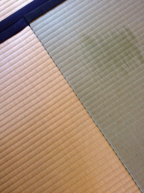 昔ながらの道具で 203号室の畳がえをしています。 「畳と女房は新しい方がいい」と言いますが 夫も新しい方がいいんじゃないかなんて? そんな事は思いませんが なかなか新しく出来るものではありません。 なので、せめて新しい青畳を使っていただきたいものです(^^;) こんなに色が違うのですw(゚o゚)w 半年もすると青い色は抜けてしまうそうですので 早くいらして下さいませね