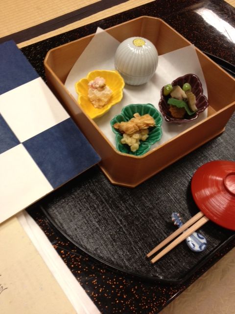 菊の花には不老長寿の薬としての信仰があり けがれを祓い長寿を願います。 藍で染めた市松模様の油障子は 菊作りの屋根でして 雨をはじき、 強い日差しから菊を守ります。 油障子の中は菊の花と葉の器です 今日からお料理が変わりました