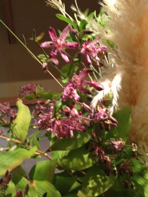 駐車場のところに 自生しているホトトギスの花があったので 一階にある室町「中期」の常滑の壺 にいけました