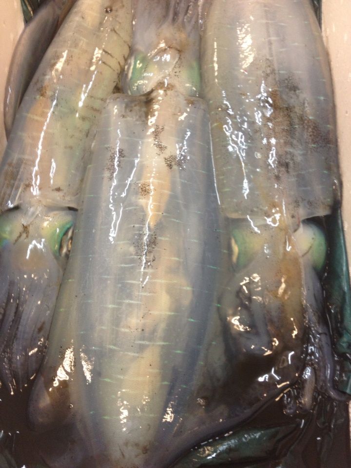 朝の調理部は水族館みたいに 色んなお魚がいます♫ 上は、コブダイまたの名を寒鯛。 おでこにタンコブがあるんです。 下のシマシマは石鯛。 まだ少し動いています。 ピカピカ綺麗な目をした アオリイカもいました。