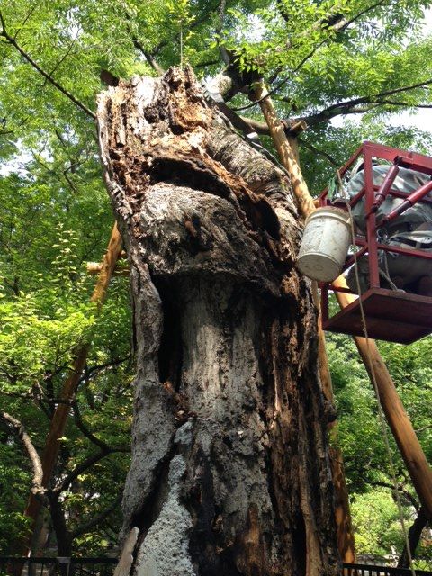 雷が落ちてもまだ青々した葉をつけている御神木のケヤキに驚き