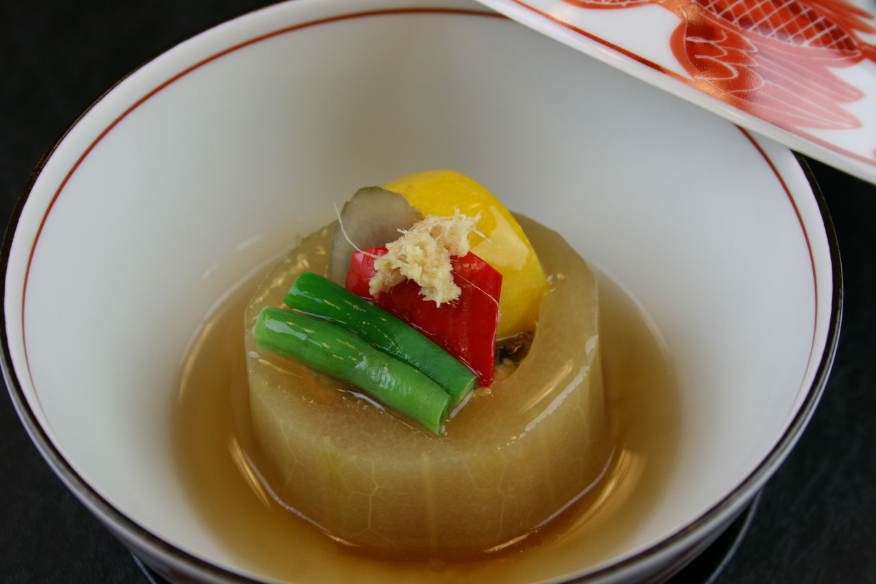 今月の蓋物(ふたもの) 加賀野菜の太胡瓜をくりぬき 鰻、新牛蒡、いんげん、万願寺唐辛子、 などを詰めて生姜とあんを掛けました。 太胡瓜は体の余分な熱をとり 新牛蒡は腸を整え 鰻で体力をつけるといった 夏の体を整える煮物です。 8月2日、3日はやっさ祭 バス通りには提灯が並び わくわくしてきます