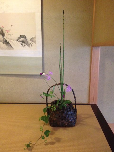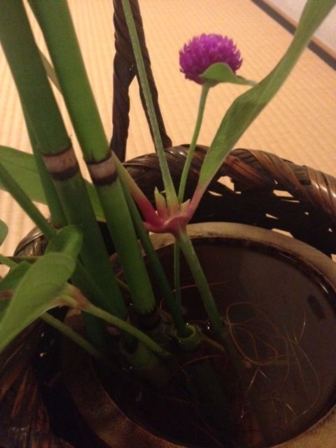 今日の玄関です トクサ リューココリーネ 千日紅 山帰来 ちょっと見ずらくてすみません 剣山は使わず 防腐効果もある 丸めた銅線で花を止めています リューココリーネのように茎が細い花は ストローのように中が空洞のトクサに入れるのが 先崎先生の今日の技でした トクサは砥石として使われ お歯黒の時代は歯磨きに 音楽家の滝廉太郎は、爪を磨いたそうです