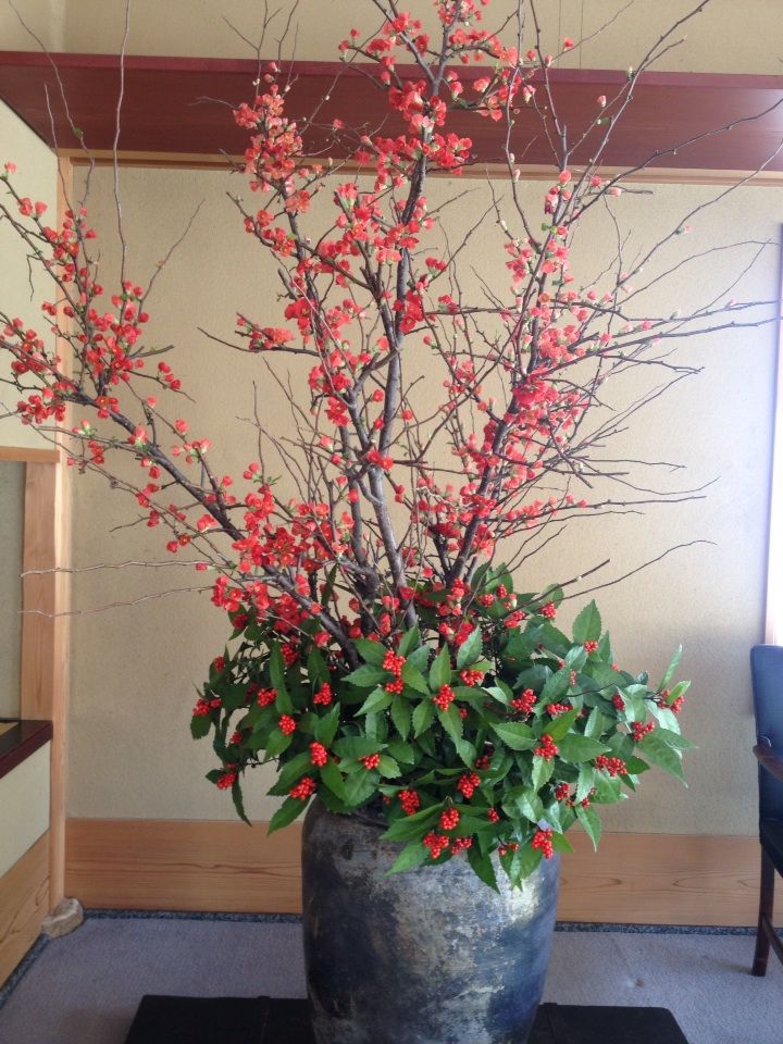 左から時計まわりに 黒松 紅梅 姫縞笹 お多福南天 葉牡丹 斑入り薮柑子(ふいりやぶこうじ→十両) 寒菊 五色砂に七種です