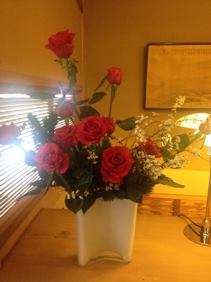 6、 一番綺麗な花を選び目立つセンターに入れて、それを引き立てる白い雪柳を入れてます。