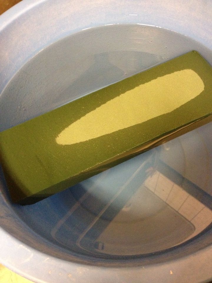 4、 オアシス(百均にも売っています)をバケツの水の上に乗せて自然に沈むのを待ちます。←ポイントはここ