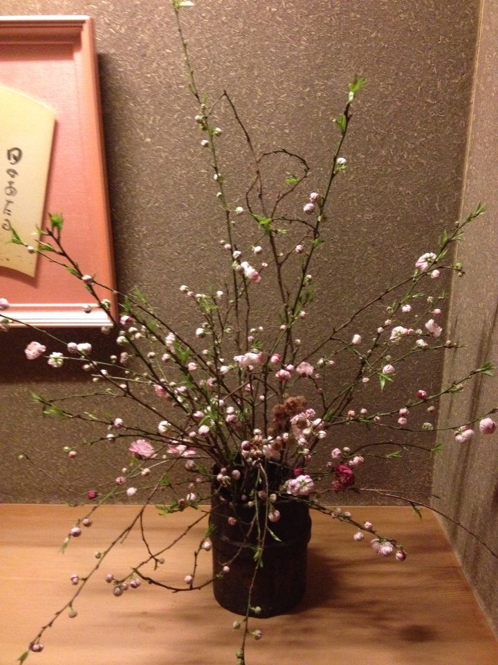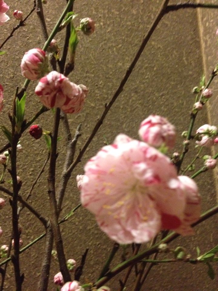 源氏の白、平家の紅が混ざって咲く可愛い桃です。 漆桶にいけました。