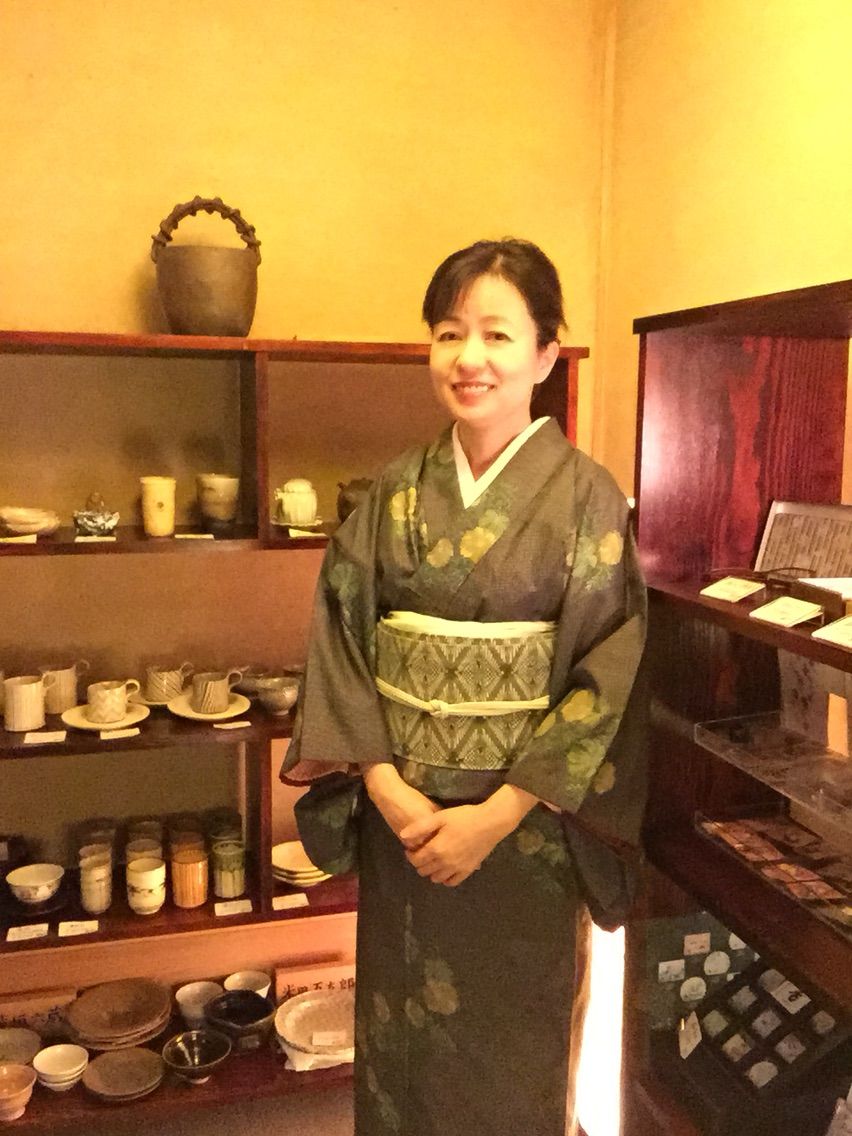 ふきやの売店の棚は 建築家、木島徹さんにお願いして作って頂いた物です 京都で活躍されている木島さんは Casa 12 メイドイン京都カタログに 出ております(P86) お気に入りのこの着物は 菊柄の大島紬 帯は南部型染蛭子屋さんのものです