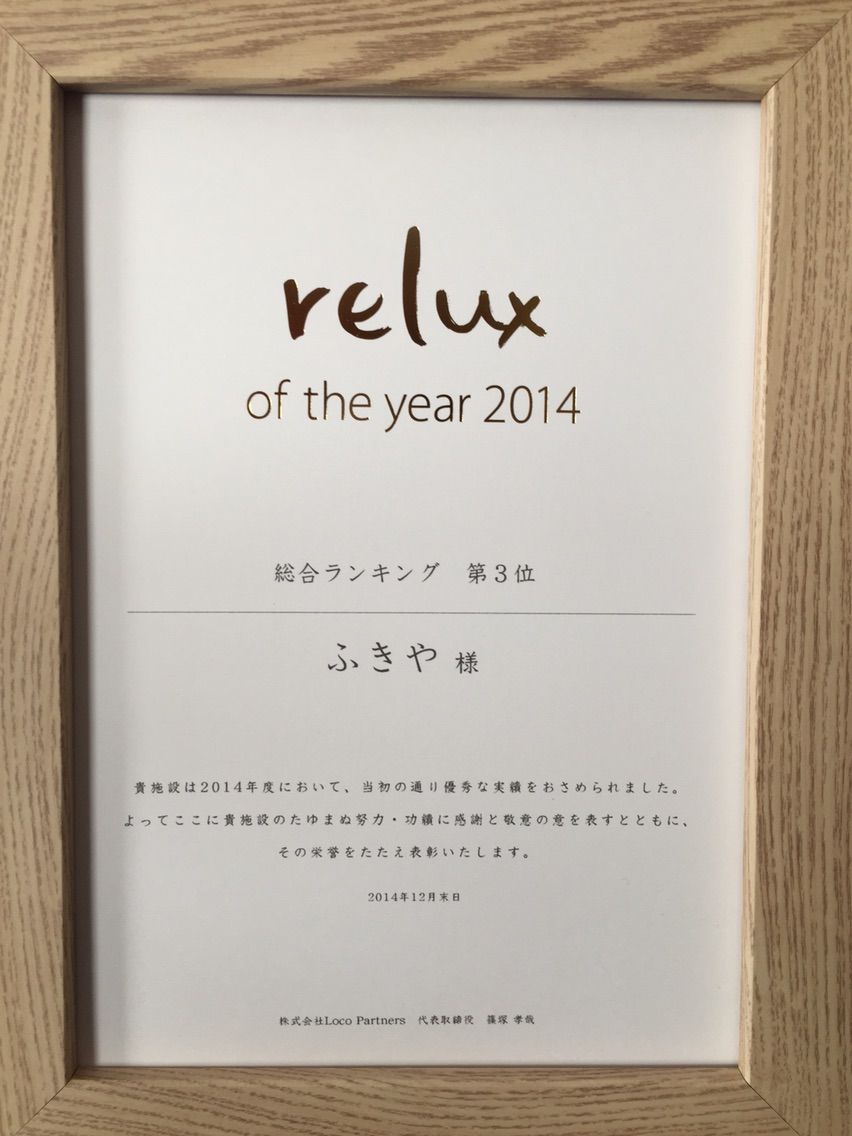 旅館予約サイト「リラックス」 ランキング3位の表彰状を頂きました。