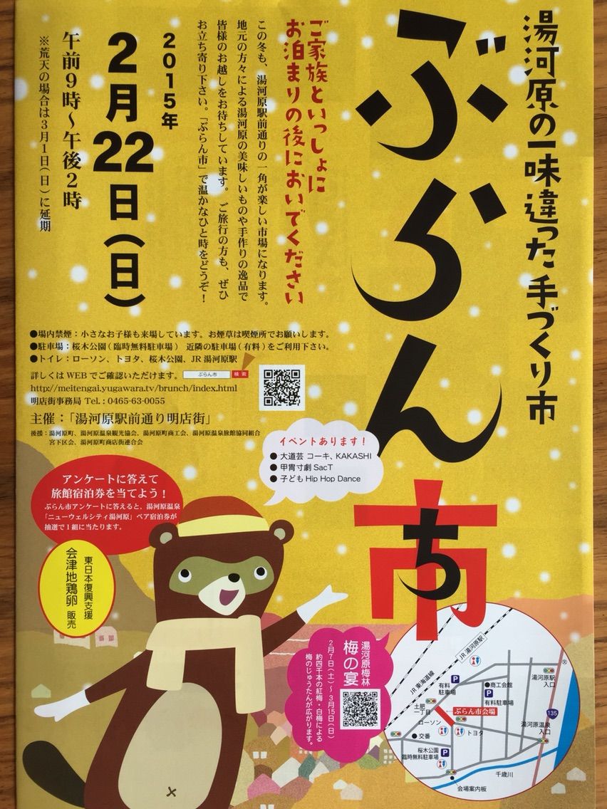 2月22(日) 午前9時~午後2時 湯河原駅前通りの一角が 楽しい市場になります♫ ここにしかないものばかり 石窯で焼いたパンや 畳職人が作る畳表や縁で作った小物 添加物なしの干物「がんこ干し」 バナナカレーなどなど 気になる商品ばかりです 是非お出かけくださいませ