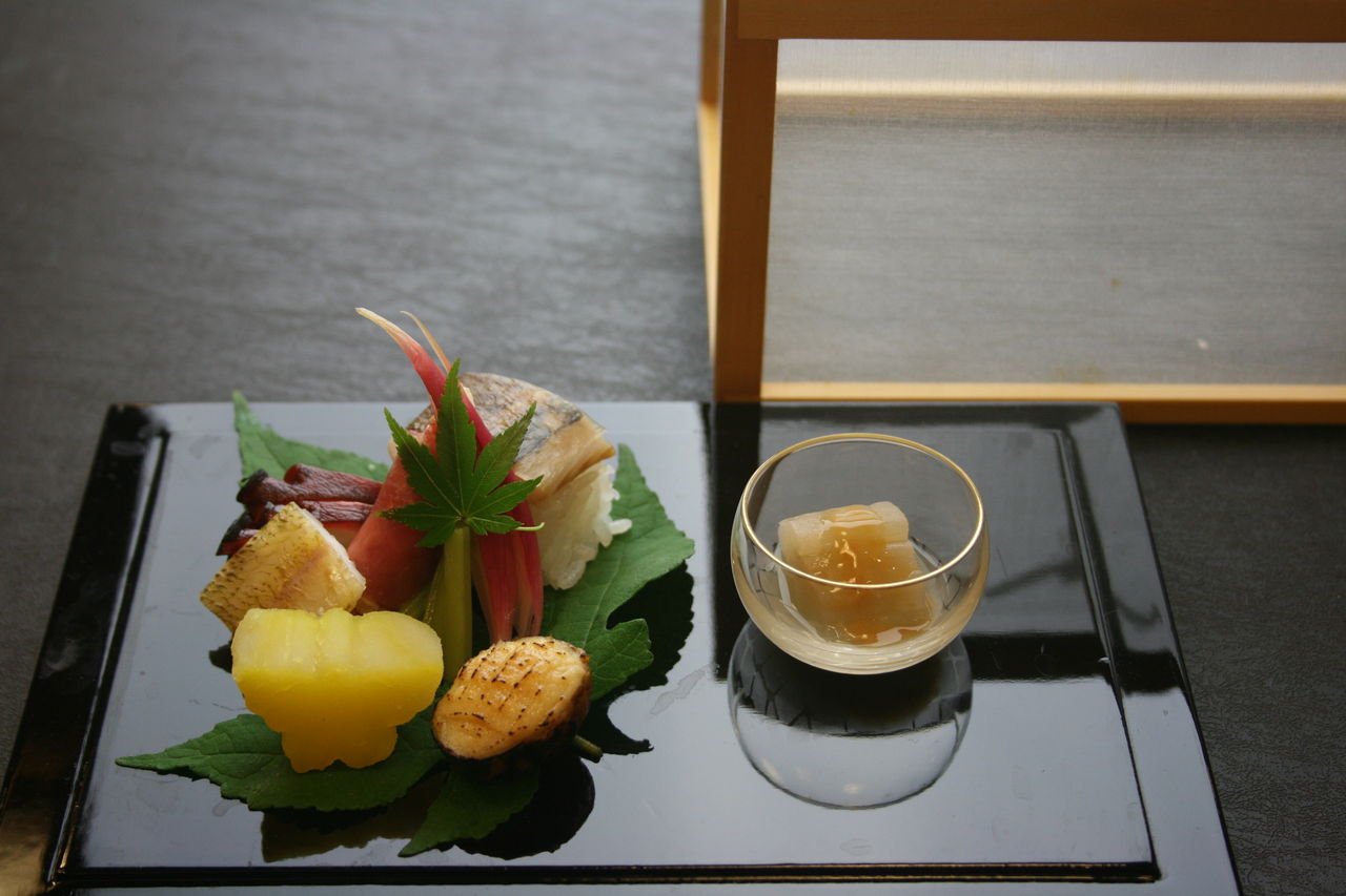 水無月のお料理になりました 前菜 ダツの海鼠腸(このわた)がけ キス干し 地鯵小袖寿司 新じゃが田楽 みず昆布〆 いちじく生ハム巻 サツマイモ 蛸燻製 酢取り茗荷 今月もご馳走盛り沢山 京都・宮津・丹後の生とり貝も出ます 生でも食べられますが 炭でちょっと炙ってどうぞ