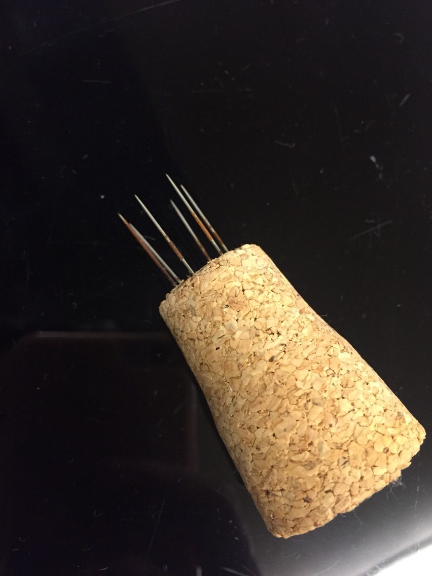 ワインコルクに綿針を埋め込んだ道具を作り、梅に無数の穴をあけます