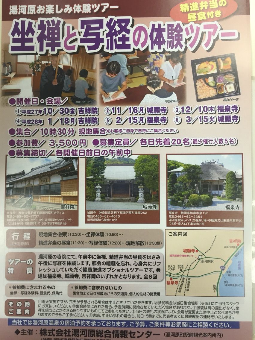 午前中に座禅、精進弁当の昼食をはさみ 午後に写経を体験します。 都会の喧騒を忘れ、心身共にリフレッシュして頂く 健康増進オプショナルツアーです 10月30日(金) 吉祥院 11月16日(月) 城願寺 12月10日(木) 福泉寺 1月18日(月) 吉祥院 2月15日(月) 福泉寺 3月15日(火) 城願寺 現地集合10時30分 13時30分解散 参加費3500円 各日先着20名様です お申込みは0465-63-5599 湯河原総合情報センター