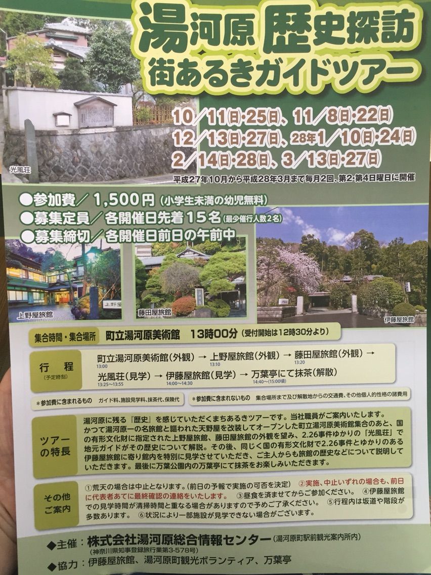 12月13日、27日 1月10日、24日 3月まで第2第4日曜日に開催 参加費 1500円 2・26事件の光風荘など地元ガイドが 歴史の解説を聞いて 最後は万葉亭にて抹茶をいただきます 集合は1時 湯河原町立美術館 ちなみに町立美術館はお庭も美しく 11月29日までライトアップもしています 庭園入場無料(16:30~20:30) 申し込みは湯河原総合情報センター 0465-63-5599