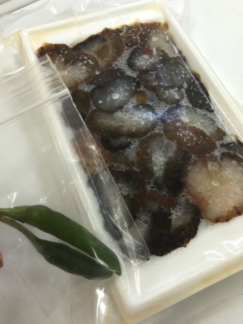 湯河原にある沖水産は 伊勢海老や鮑、タカアシガニや 干物、鰻などなど 美味しい物が沢山あります 買い物に行ったら 金目鯛と大根を煮てていい匂い~ 一つご馳走になっちゃいました スライスしてある冷凍ナマコも 自宅用に購入。 青唐辛子を刻んでポン酢で食べると美味です