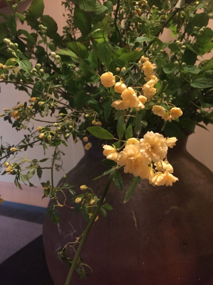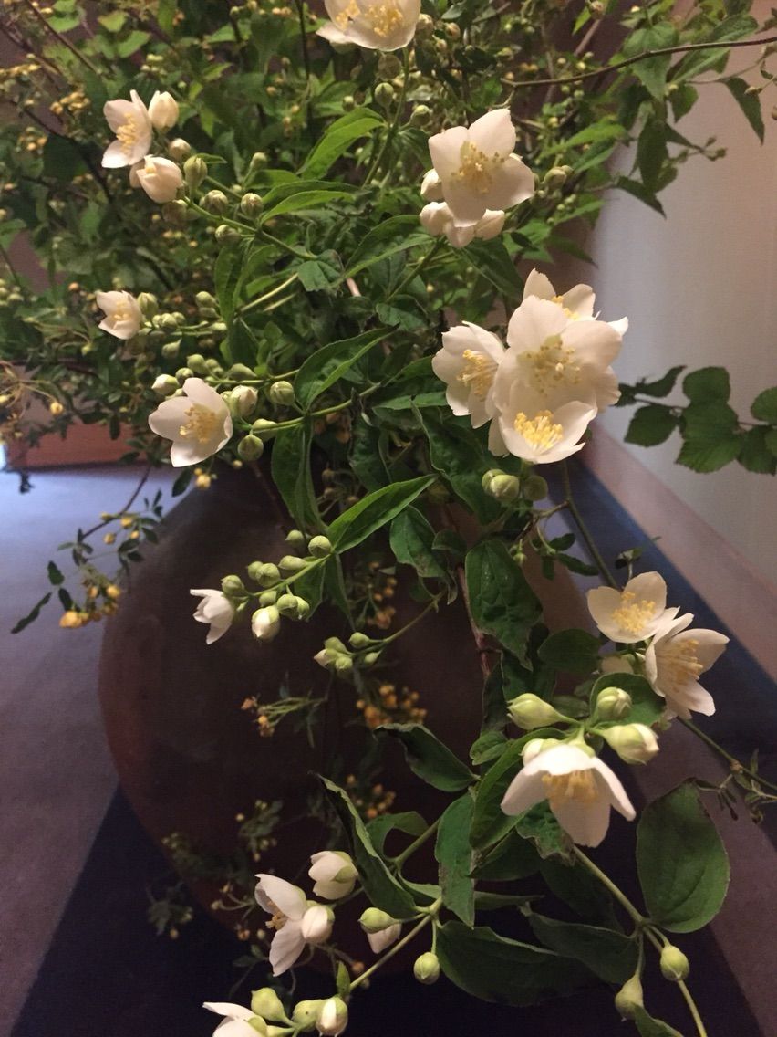 一階にある室町中期、常滑の壺は 姫水木の葉 モッコウバラ バイカウツギです