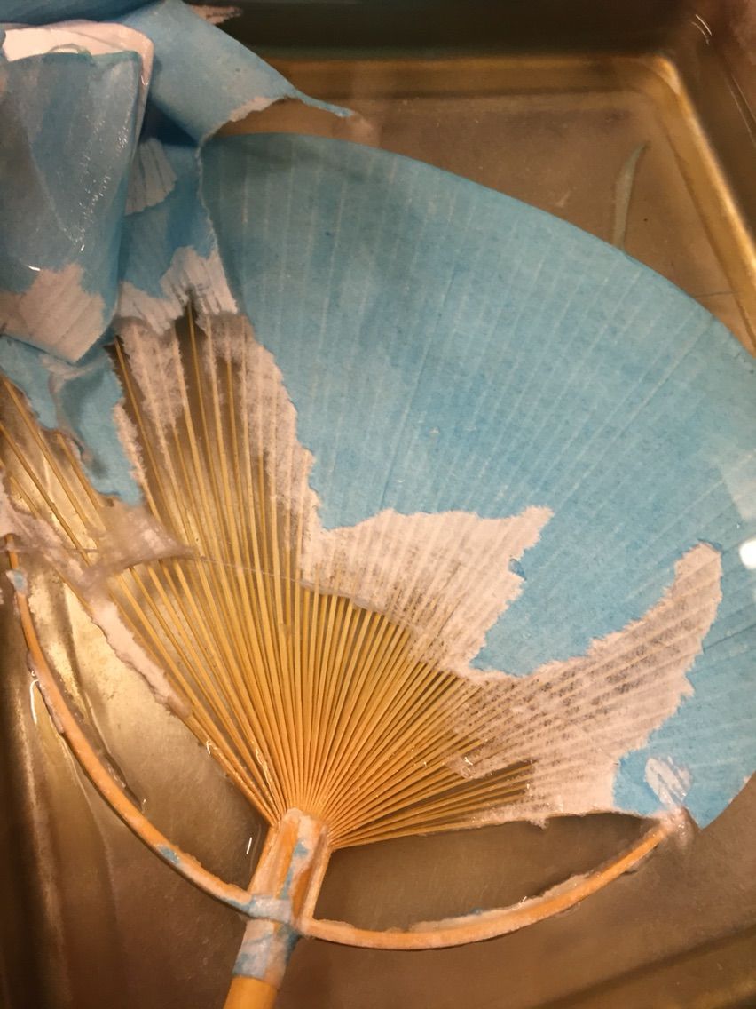池田含香堂さんの団扇が 破れてしまったので 濡らして紙をはずし 自分で染めた和紙に 雲母を版木で押した 唐紙を木工ボンドで貼ってみました。 古今和歌集を書いて 出来上がり~ 「重ねても涼しかりけり夏衣 うすき袂にやどる月影」