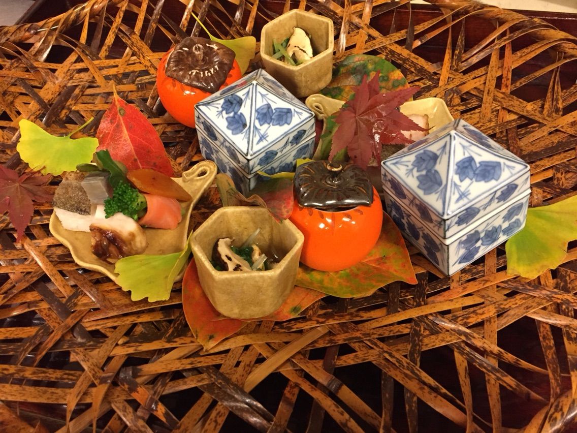 秋時雨が一つやむごとに だんだん寒くなって参りました。 山の木々も赤や黄などに色を染め 華やかな錦秋の季節となっていきます。 今日の前菜は そんな季節に見立てて 吹き寄せ盛としました 霜が初めて降りる頃 足元から冷えが来ないよう ご自愛ください