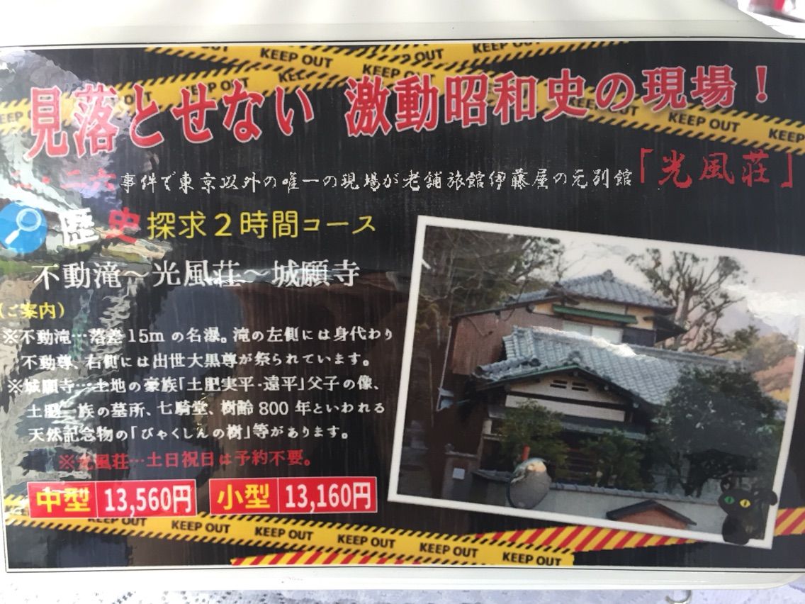 湯河原のタクシーの中で 見つけました 湯河原の歴史探求2時間コース 13560円 不動滝~光風荘~城願寺 光風荘は、東京以外で唯一2.26事件の現場です。 見学には事前予約が必要ですので お早めにお申込みくださいませ 伊豆箱根交通 0465-62-2545