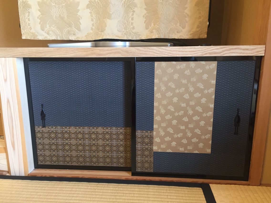 TVの下は源氏香の模様と鶴さんです 最近は出かけても襖の引手が気になる私です