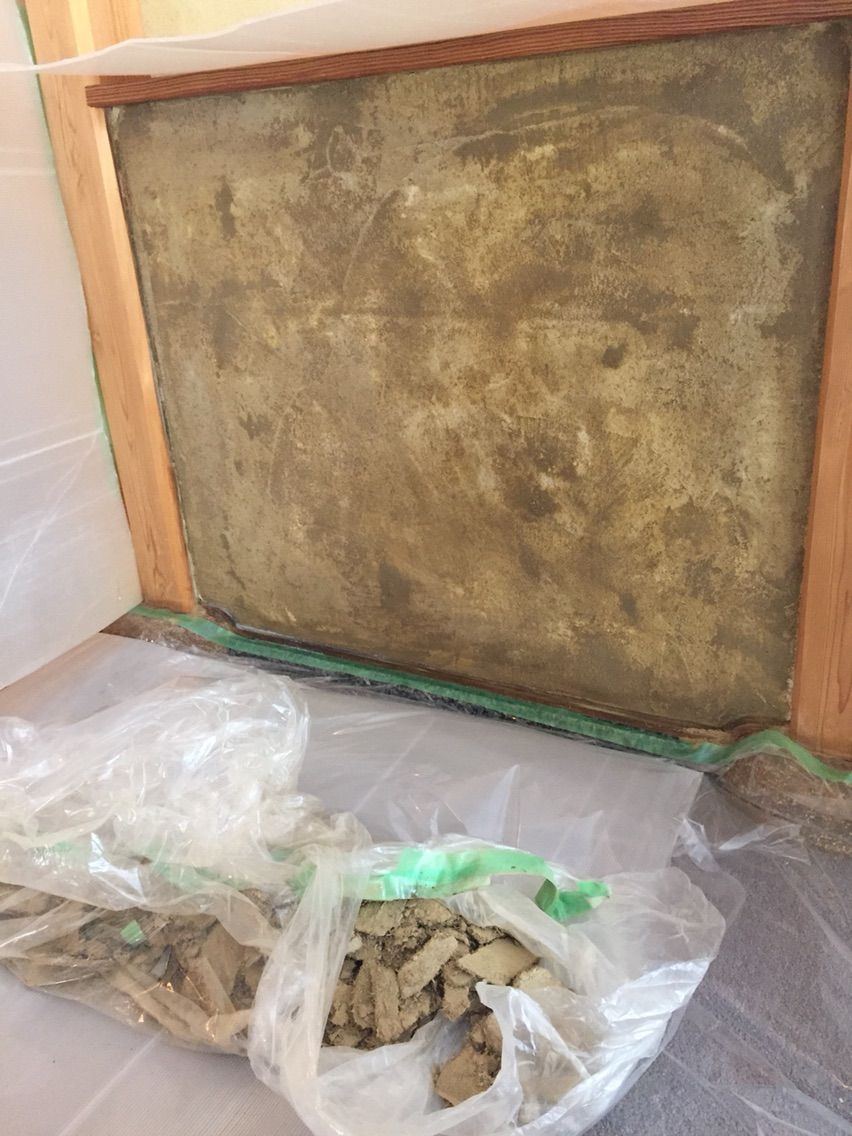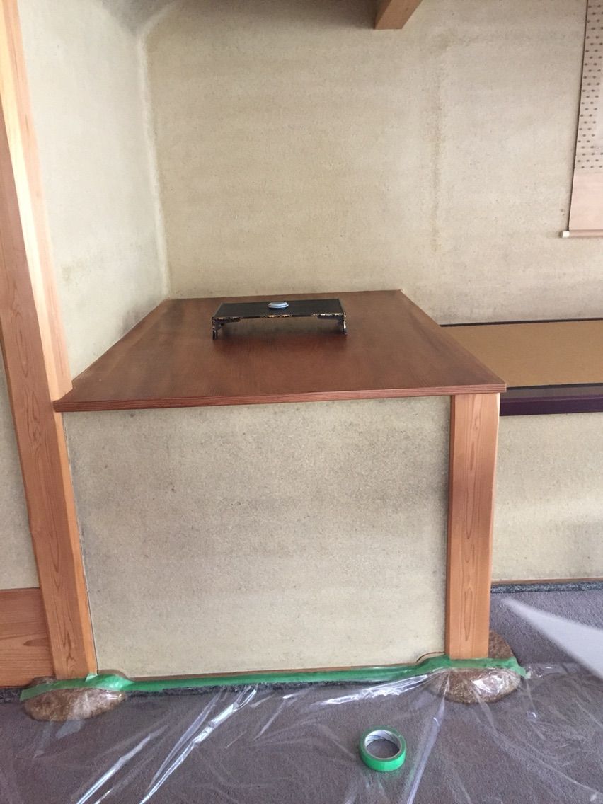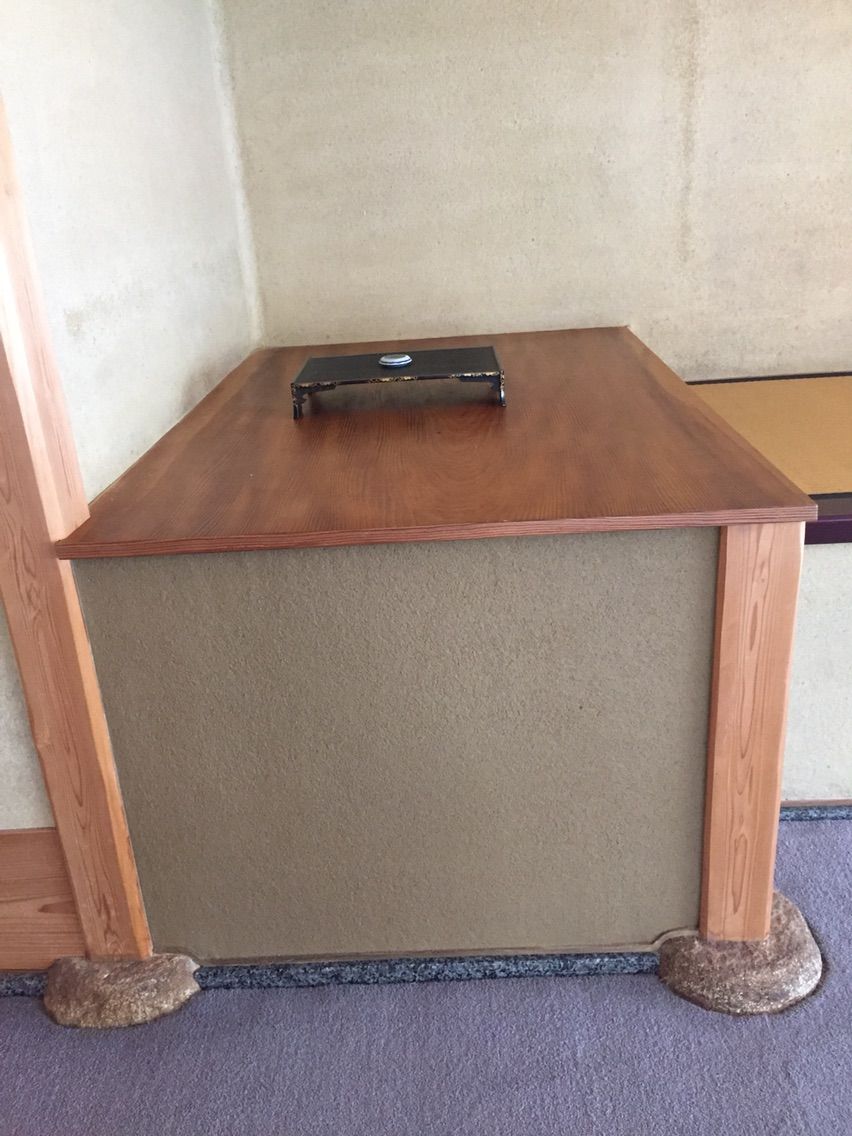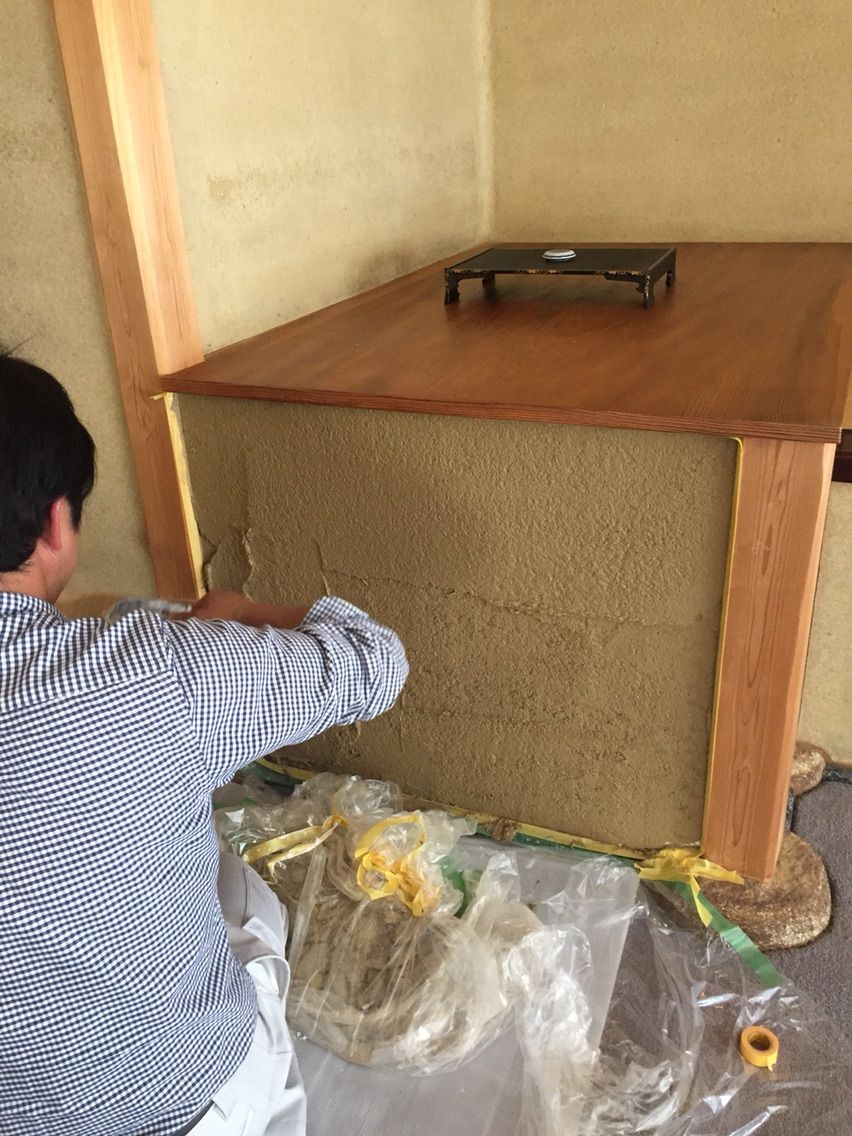 聚楽壁とは、 京都西陣の聚楽第跡地付近から産出される本聚楽土を使う 伝統的な仕上げ用の土壁です。 6月の改装工事に向けて 京都から職人さんが来ました。 ここの部分を塗り替えます。 古い土をはがします。 接着剤の無い本物だけの材料なので 厚く塗ります。 数日後、乾いて綺麗に仕上がりました。 見落としてしまう場所ですが、 ふきやの館内には こだわりが沢山つまっています