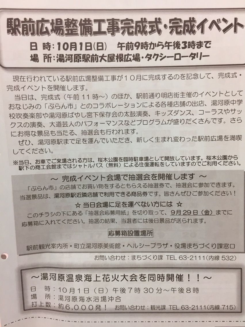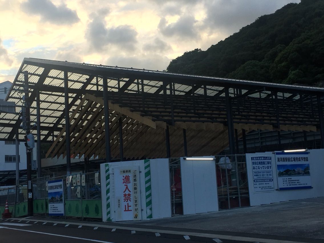 隈研吾設計事務所が手がける 湯河原駅前広場。 10月1日の完成に向けて 着々と工事が進んでいます。 10月1日は 11時からの完成式のほか 「ぶらん市」とのコラボによる出店もあり、賑やかになります。 どうぞお出かけくださいませ。 夜7時半~8時は 海上花火もございます