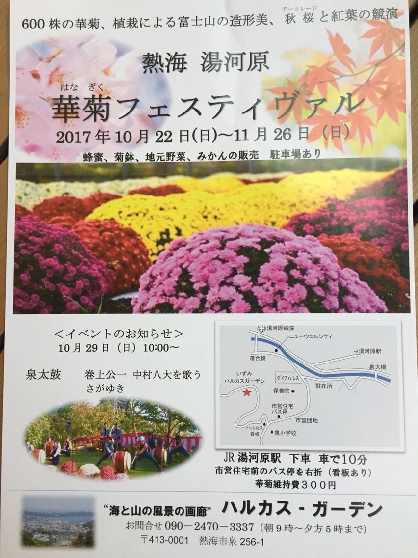 11月26日まで 「海と山の風景の画廊」 ハルカス・ガーデン 蜂蜜、菊鉢、地元野菜、蜜柑の販売あります。 〒413-0001 静岡県熱海市泉256-1(駐車場あり) 朝9時~夕方5時まで 華菊維持費300円 お問い合わせ090-2470-3337