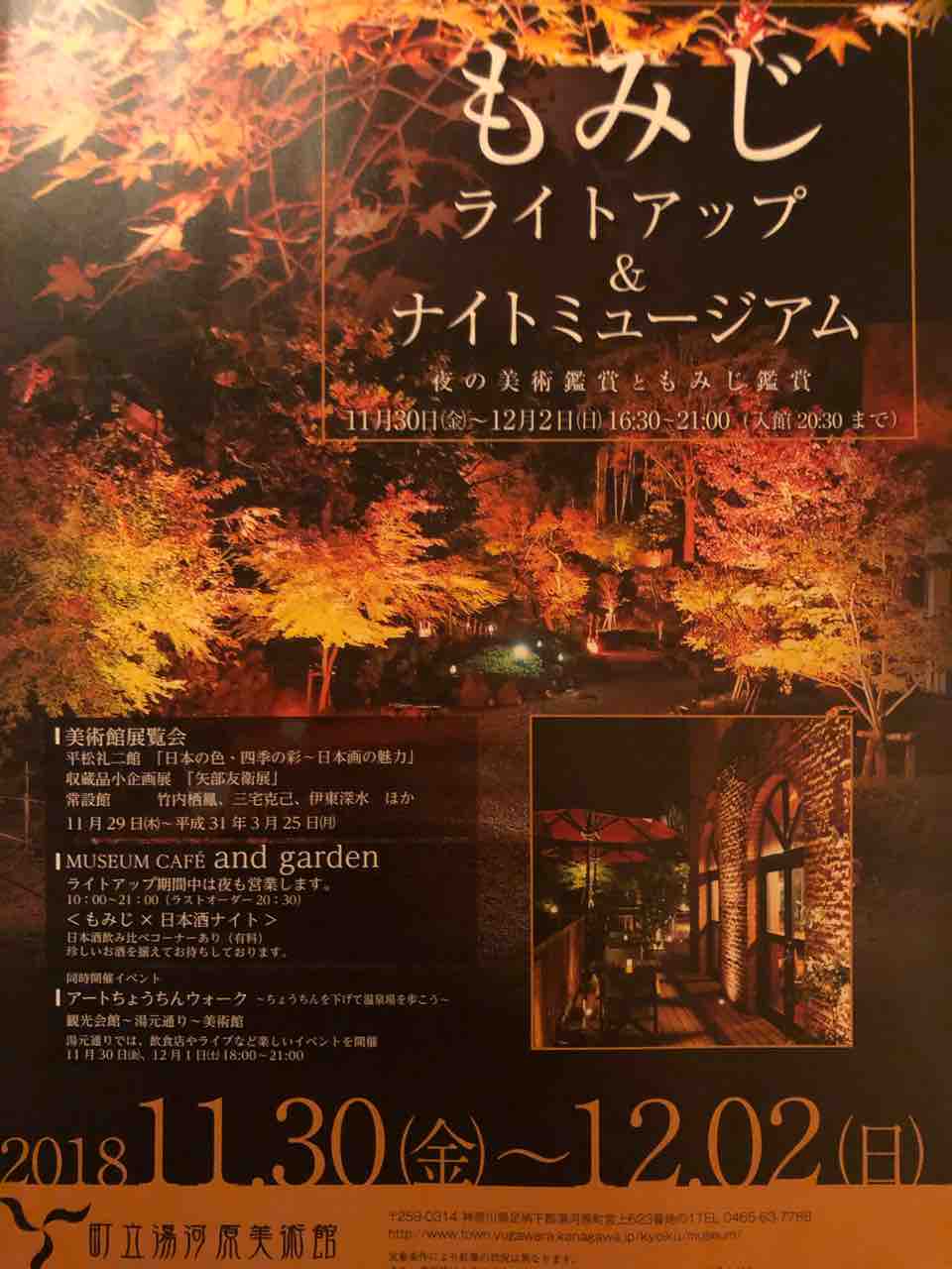湯河原町立美術館 もみじライトアップ& ナイトミュージアム 夜の美術鑑賞ともみじ鑑賞 12月2日(日)まで ミュージアムカフェ アンドガーデンでは もみじ✖️日本酒ナイト 日本酒飲み比べコーナーもあり 珍しくお酒を揃えてお待ちしております