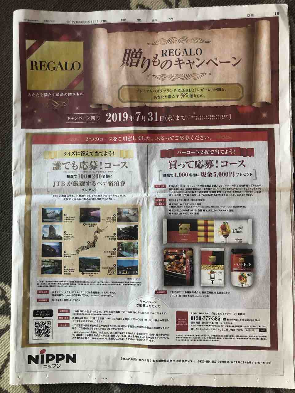 NIPPN(ニップン)日本製粉の 「レガーロ」キャンペーンに ふきやが載っております。 レガーロのパスタと パスタソース、知りませんでした 早速買います! 14日読売新聞一面広告でした。 全国の旅館、ホテル10軒の 宿泊券が当たります。 誰でも応募できますので 私も早速ふきやじゃない 憧れの旅館に応募しました