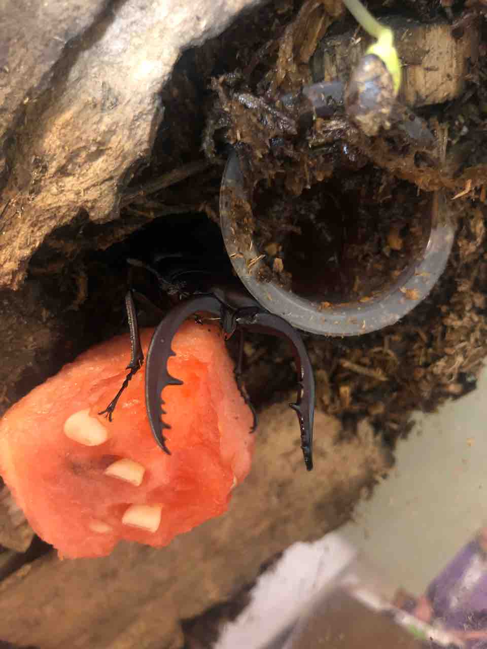 ある日、ふきやに来たクワガタ君。 うちの子となり ゼリーやスイカをあげていたところ なんと、スイカの種から ニョキニョキと芽がでてきました。 スイカの成長も楽しみになり 植え替えました。 このままグングン 大きく育ってスイカが収穫できれば…? などと妄想する私です