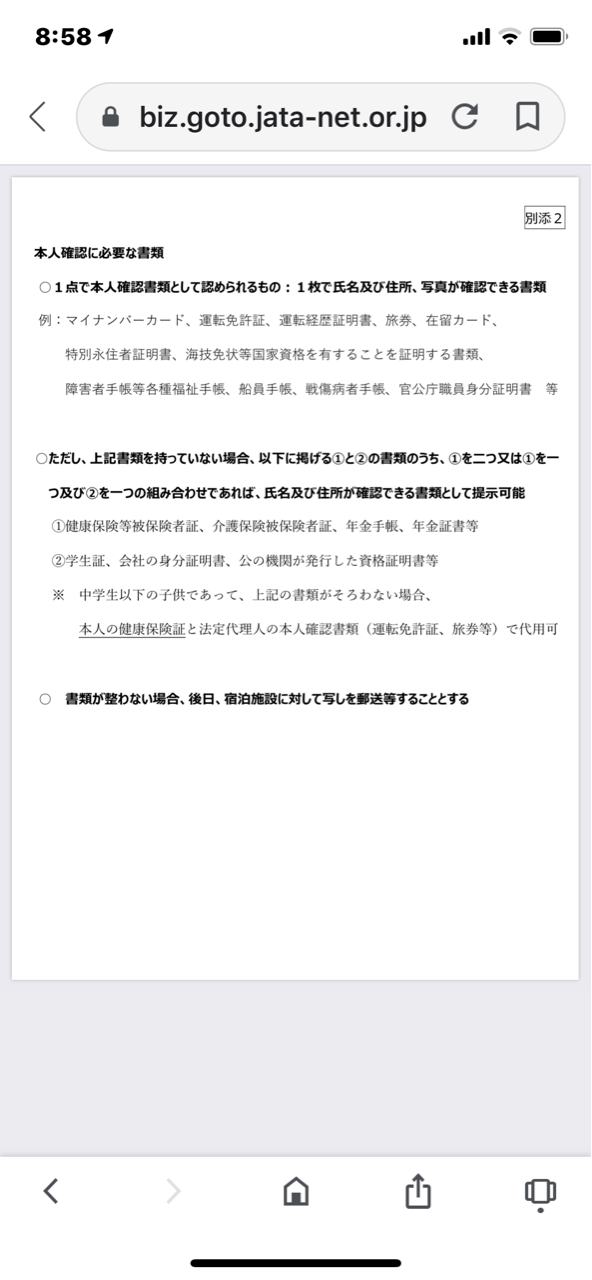 観光庁のHPより https://www.mlit.go.jp/kankocho/page01_000637.html GOTOキャンペーン利用のお客様は 同行者の方も全員 本人確認をさせて頂きます。 どうぞ ご理解とご協力をお願い致します