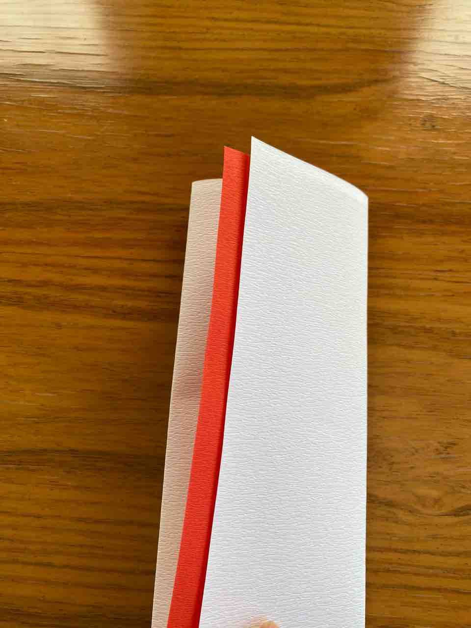切り取った赤いヒモ状の紙でとじて