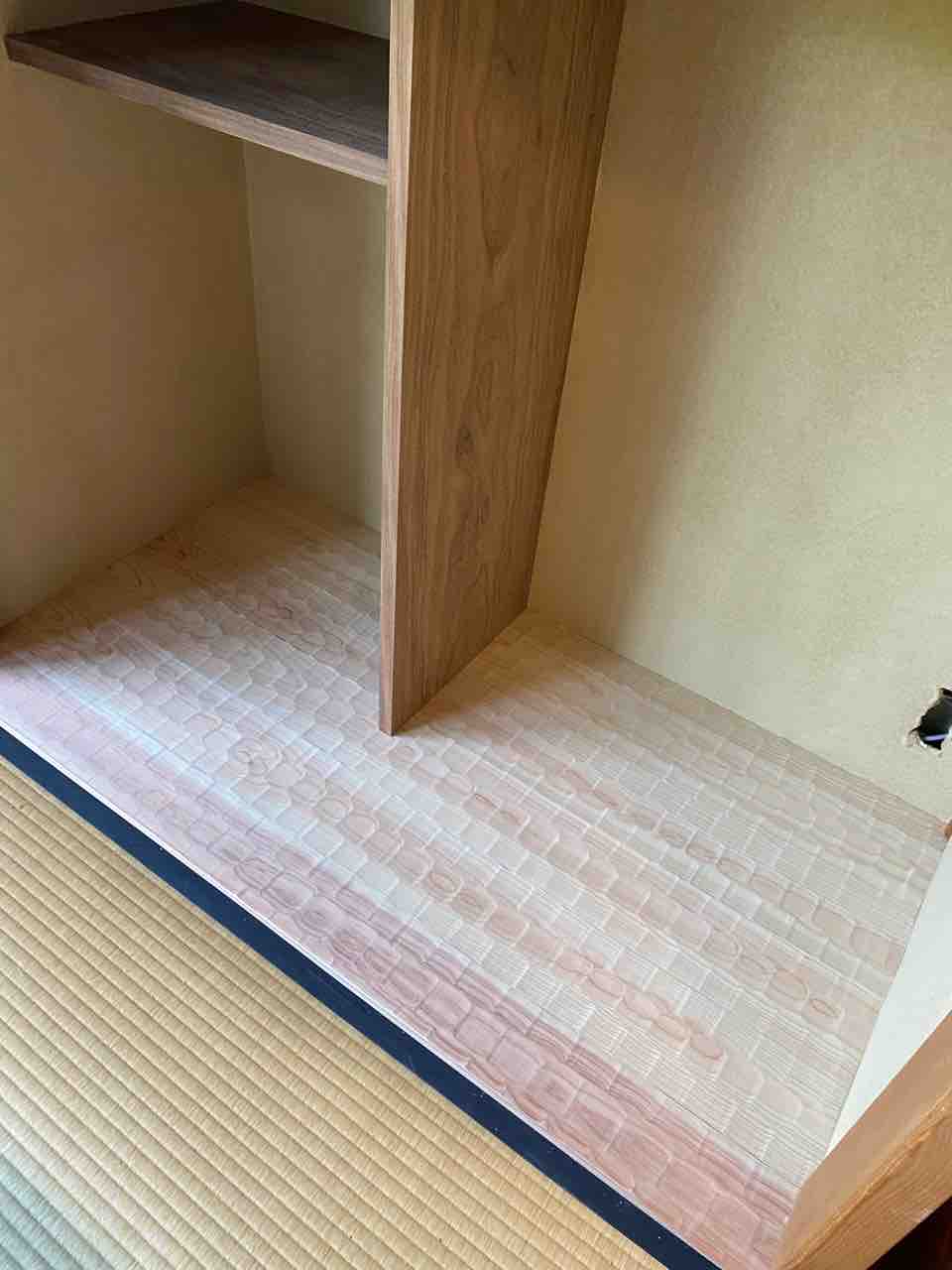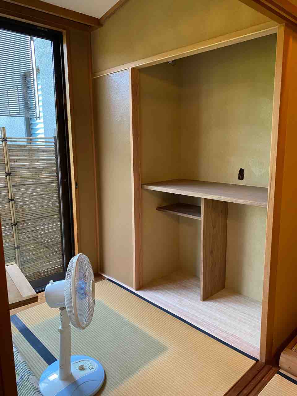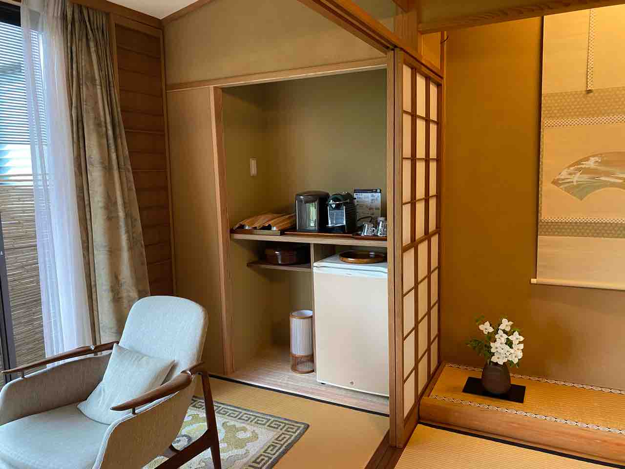 次の間に電動ベッドが二つあるツインベッドルームです。 クローゼットが本間と次の間に二つあり本間のクローゼットは皆様ほとんど使われないのでコーヒーマシンを置くコーナーに改装しました。 クローゼットを壊してから 左官屋さんが塗った壁を扇風機で乾かします。 ネスプレッソを置きました。いつでもコーヒーが楽しめます